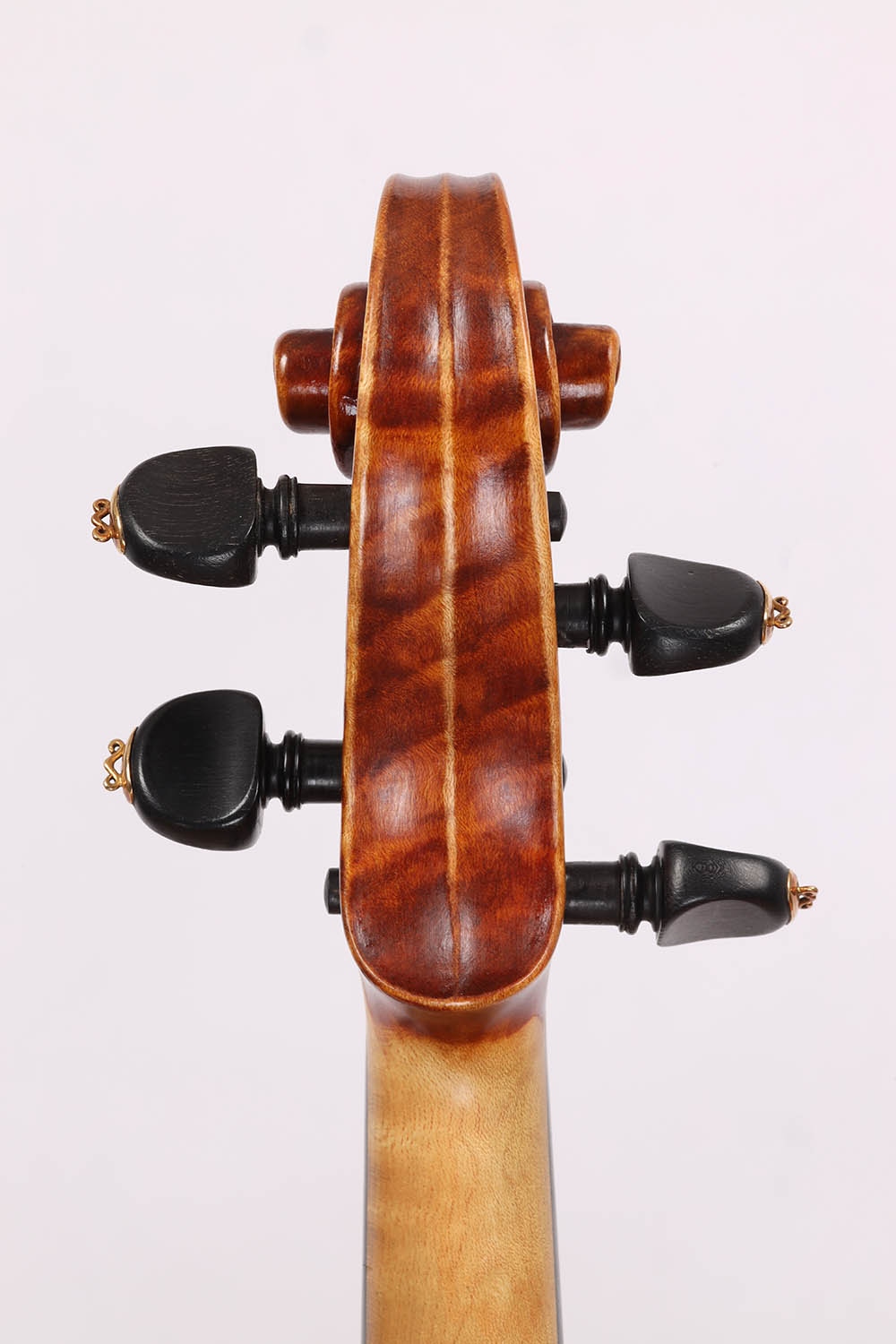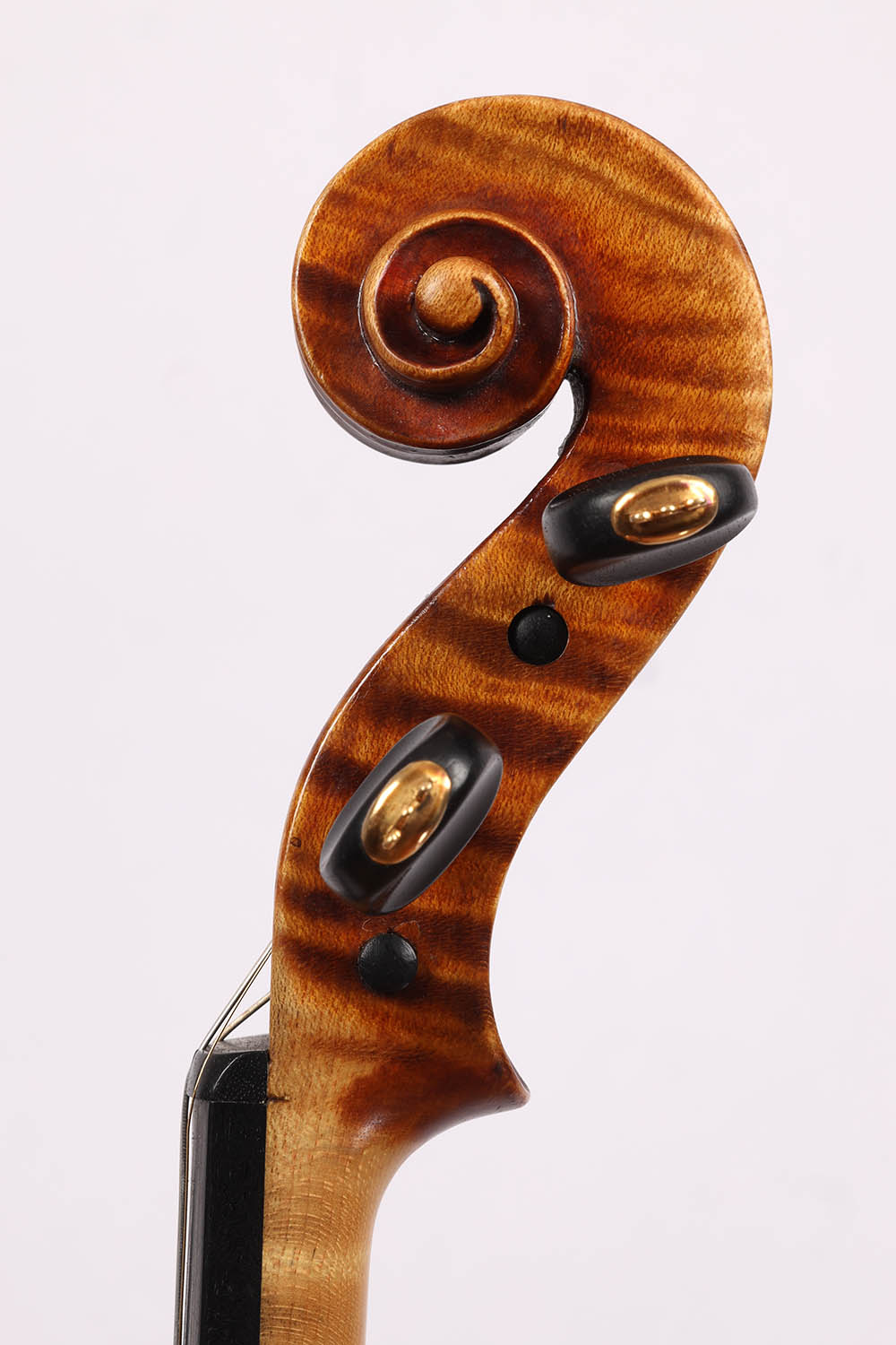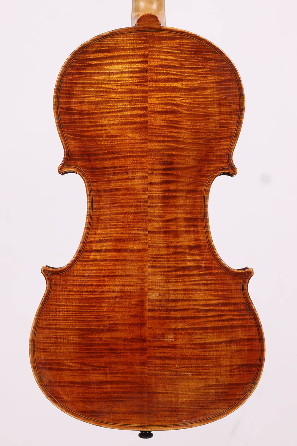 Der zweiteilige Ahornboden besticht durch seine fast horizontale, mittelbreite und tief geflammte Maserung – eine auffallend lebendige Struktur, die der Violine eine markante Optik verleiht. Der gold-orange Lack mit feiner Schattierung unterstreicht ihren eleganten Charakter. Die Wirbel sind kunstvoll verziert und passen harmonisch ins Gesamtbild.