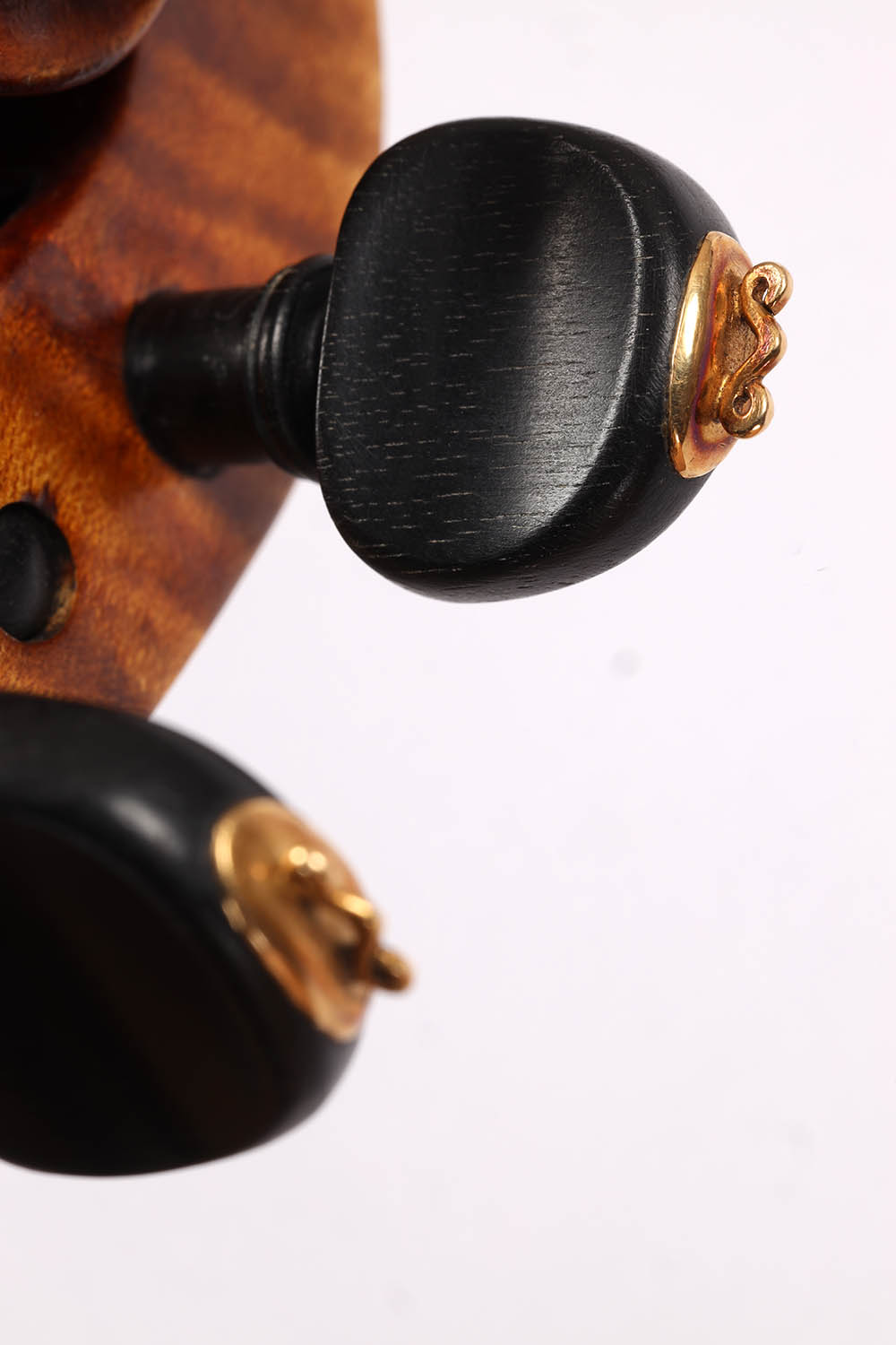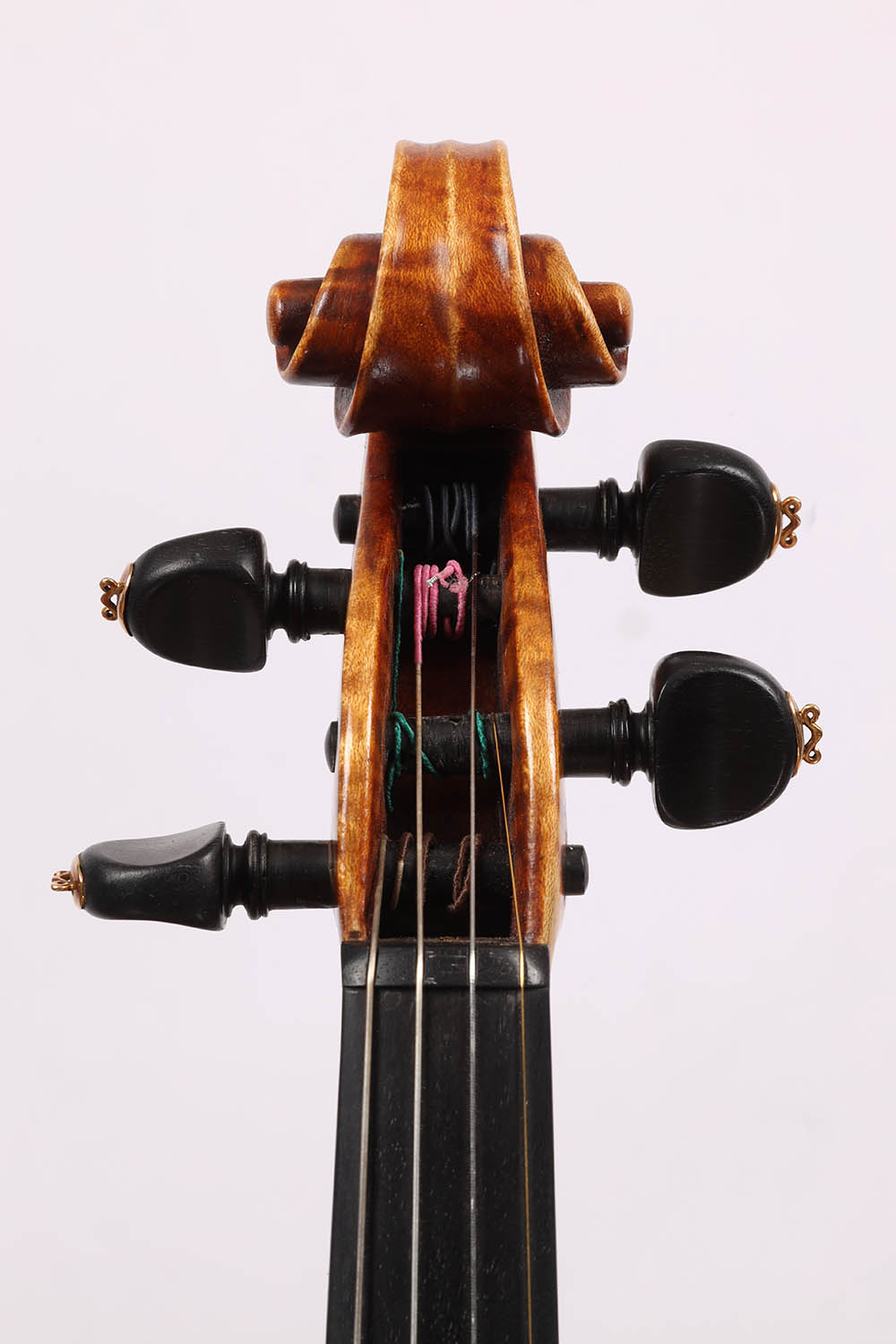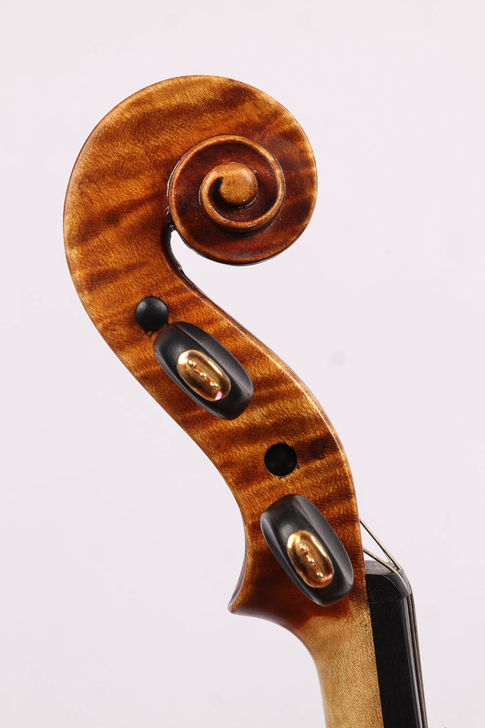 Der zweiteilige Ahornboden besticht durch seine fast horizontale, mittelbreite und tief geflammte Maserung – eine auffallend lebendige Struktur, die der Violine eine markante Optik verleiht. Der gold-orange Lack mit feiner Schattierung unterstreicht ihren eleganten Charakter. Die Wirbel sind kunstvoll verziert und passen harmonisch ins Gesamtbild.